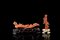 Due sculture in corallo rosso, una raffigurante Immortali su barca, con base in legno, l'altra raffigurante una dama dalle lunghe vesti, con base in avorio scolpito