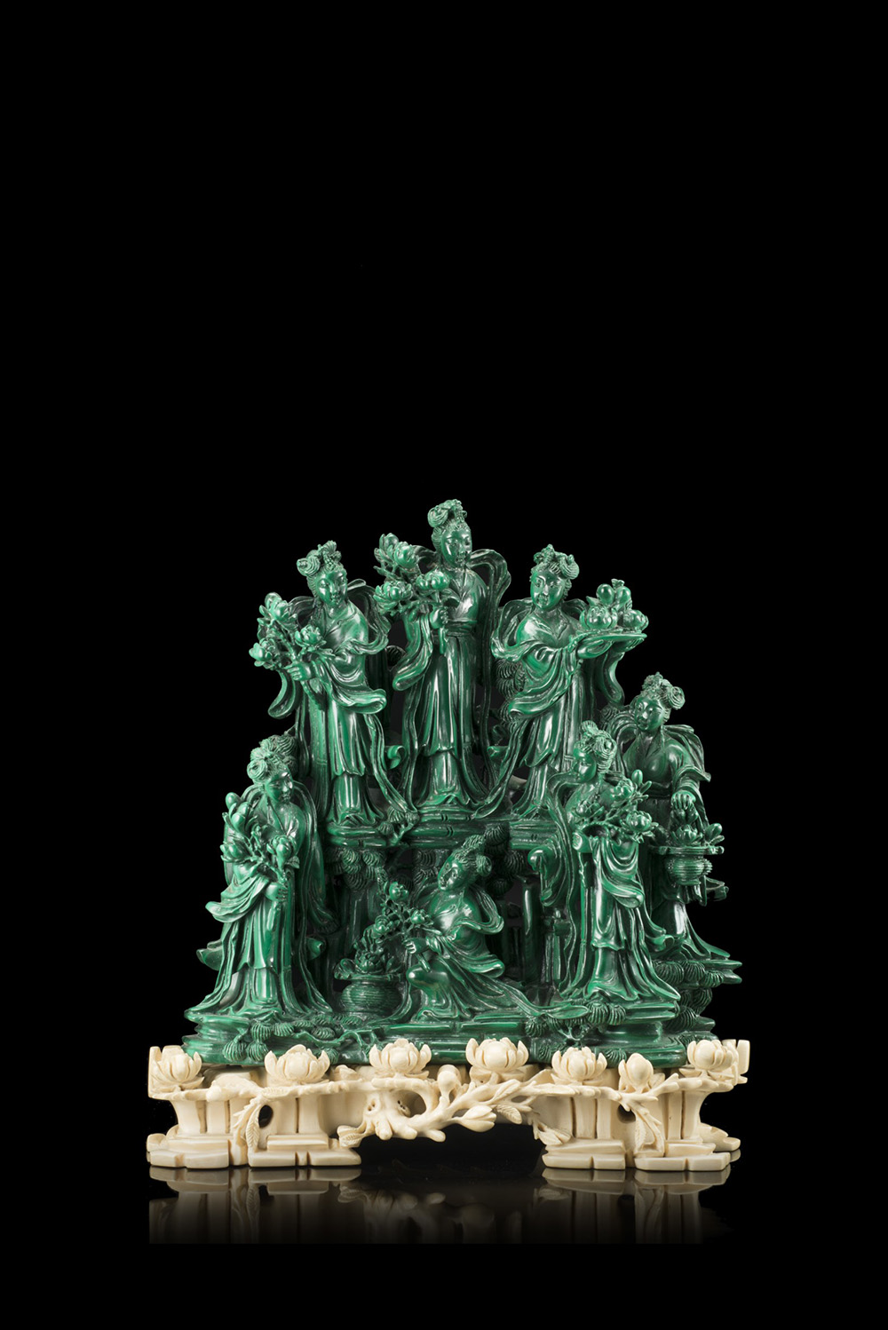 Cina, sec. XIX A malachite group finely carved with standing ladies, wearing flowing robes and fashioned hair, surrounded by flowering branches with a carved and pierced ivory base decorated with peony flowers