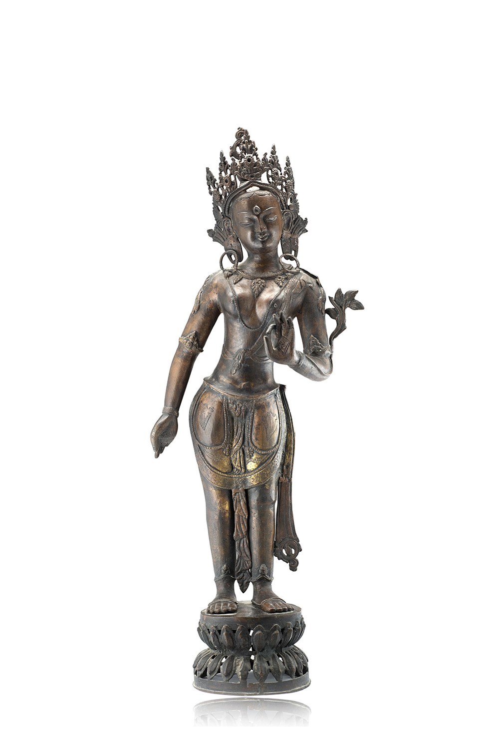 A bronze figure of a Tara, standing on a double lotus base, the exposed body adorned with flowers, necklaces and jewelry