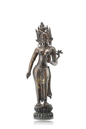 Tara in bronzo, raffigurata stante su base a doppio loto, il corpo sinuoso con vesti succinte adornato con fiori, collane e gioielli