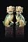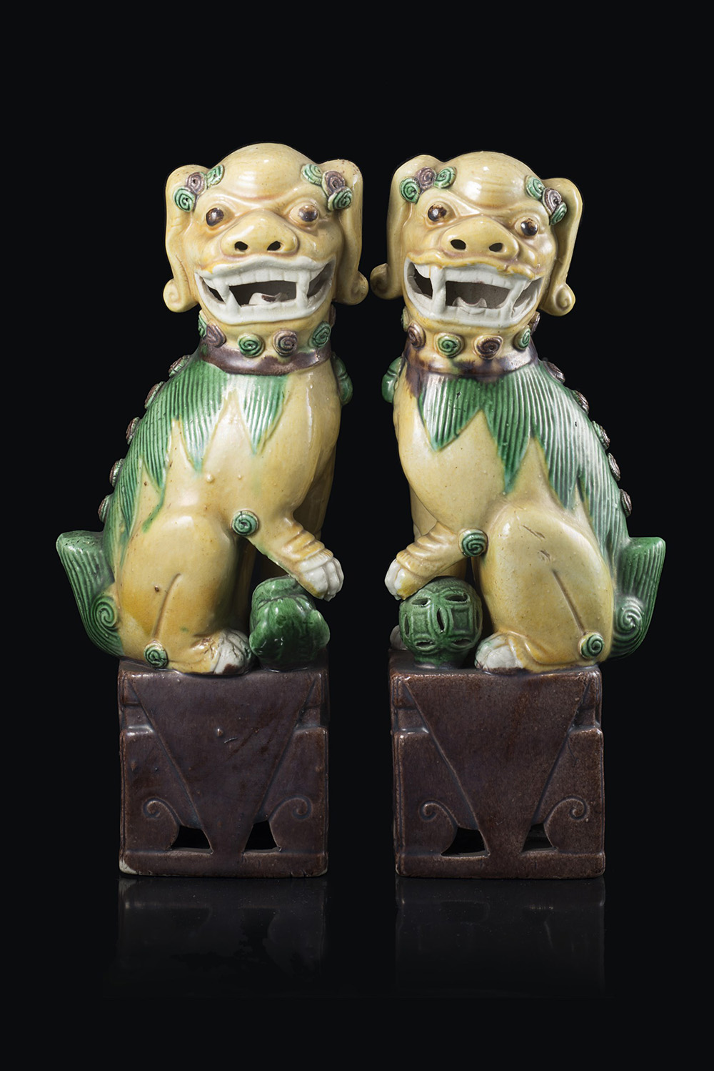 Coppia di leoni Buddhisti in biscuit smaltato in giallo, verde e ocra, raffigurati seduti su basi rettangolari, accompagnati da un cucciolo e da una palla di broccato