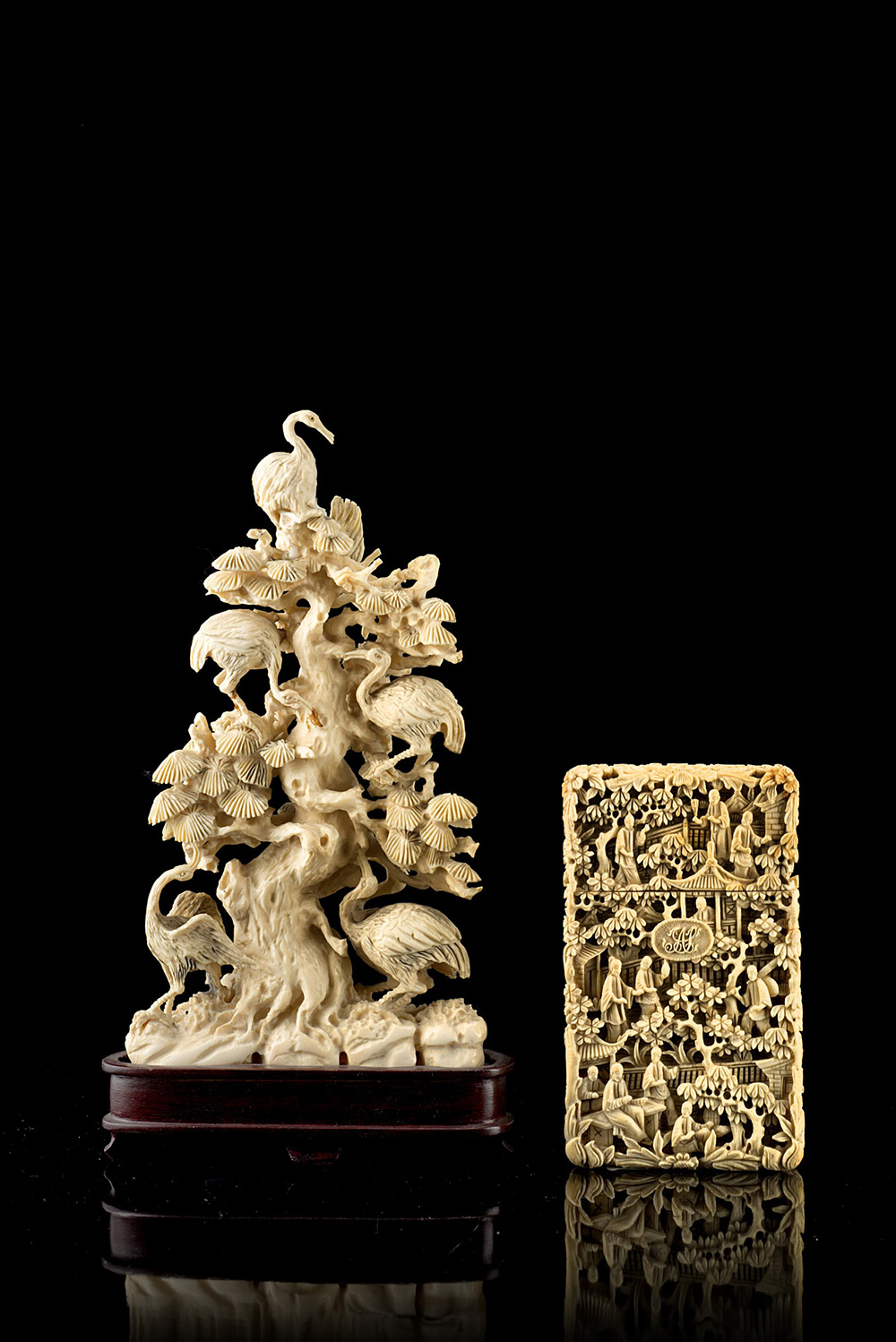 A rectangular ivory cardcase, carved and pierced and an ivory carving of a pine tree with cranes, with wood base (defects and losses)