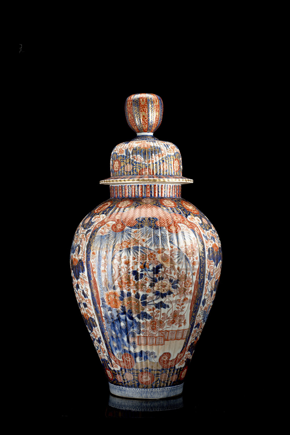 Grande vaso con coperchio in porcellana stile Imari decorato nei toni del...