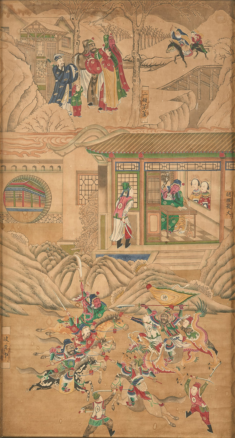 Tre pannelli dipinti raffiguranti battaglie ed episodi epici risalenti al periodo dei Tre Regni, inchiostro e colore su seta, in cornici (difetti)