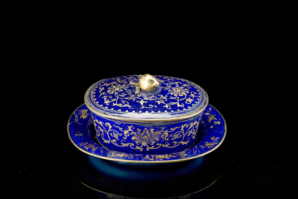 An enamelled peach-shaped box and cover with tray, decorated with gilt floral motifs on a blue ground