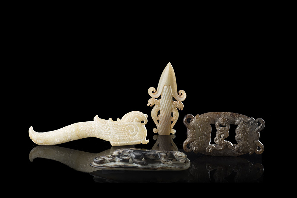 Gruppo di quattro intagli in giada in stile arcaico tra cui due fibbie