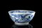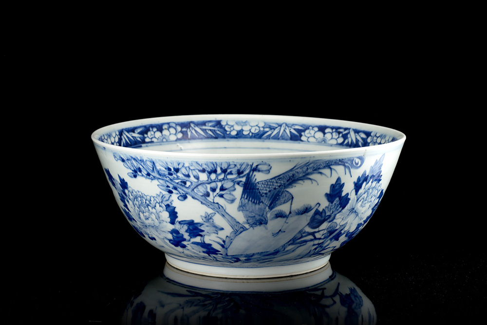 A large blue and white porcelain bowl decorated with birds perched on rocks among flowering branches