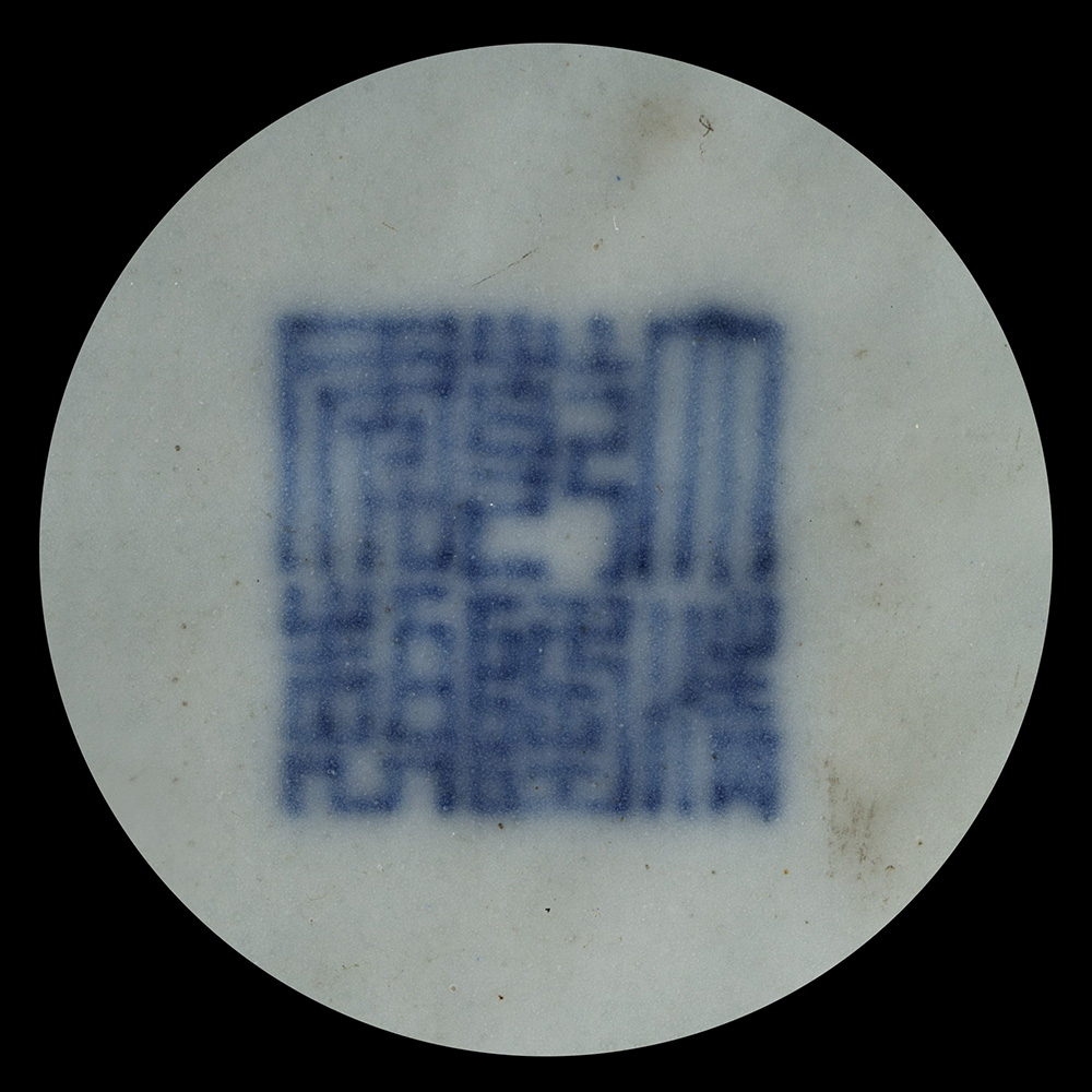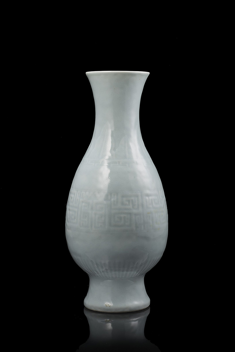 Vaso in porcellana con invetriatura clair-de-lune con decorazione arcaica geometrica sottocoperta, marchio apocrifo Qianlong sul fondo
