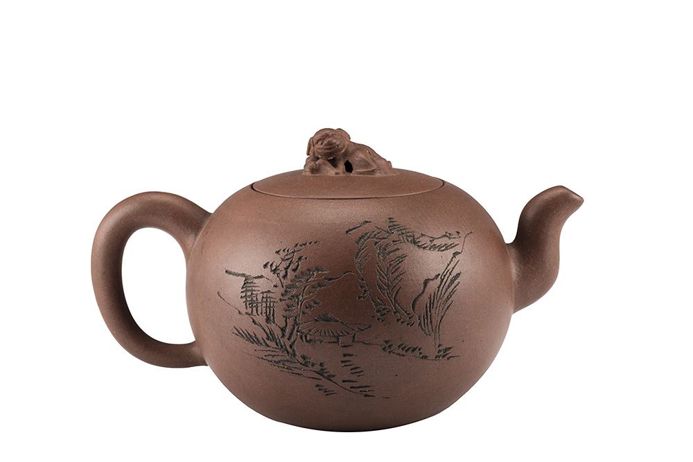 An yixing pottery teapot and cover decorated with incised motifs and calligraphy (minor flaws)