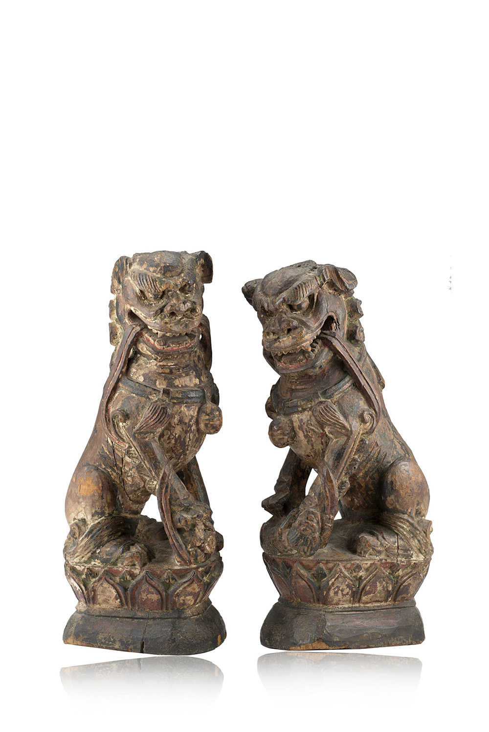 Coppia di sculture in legno raffiguranti leoni buddhisti su basi rettangolari (difetti)