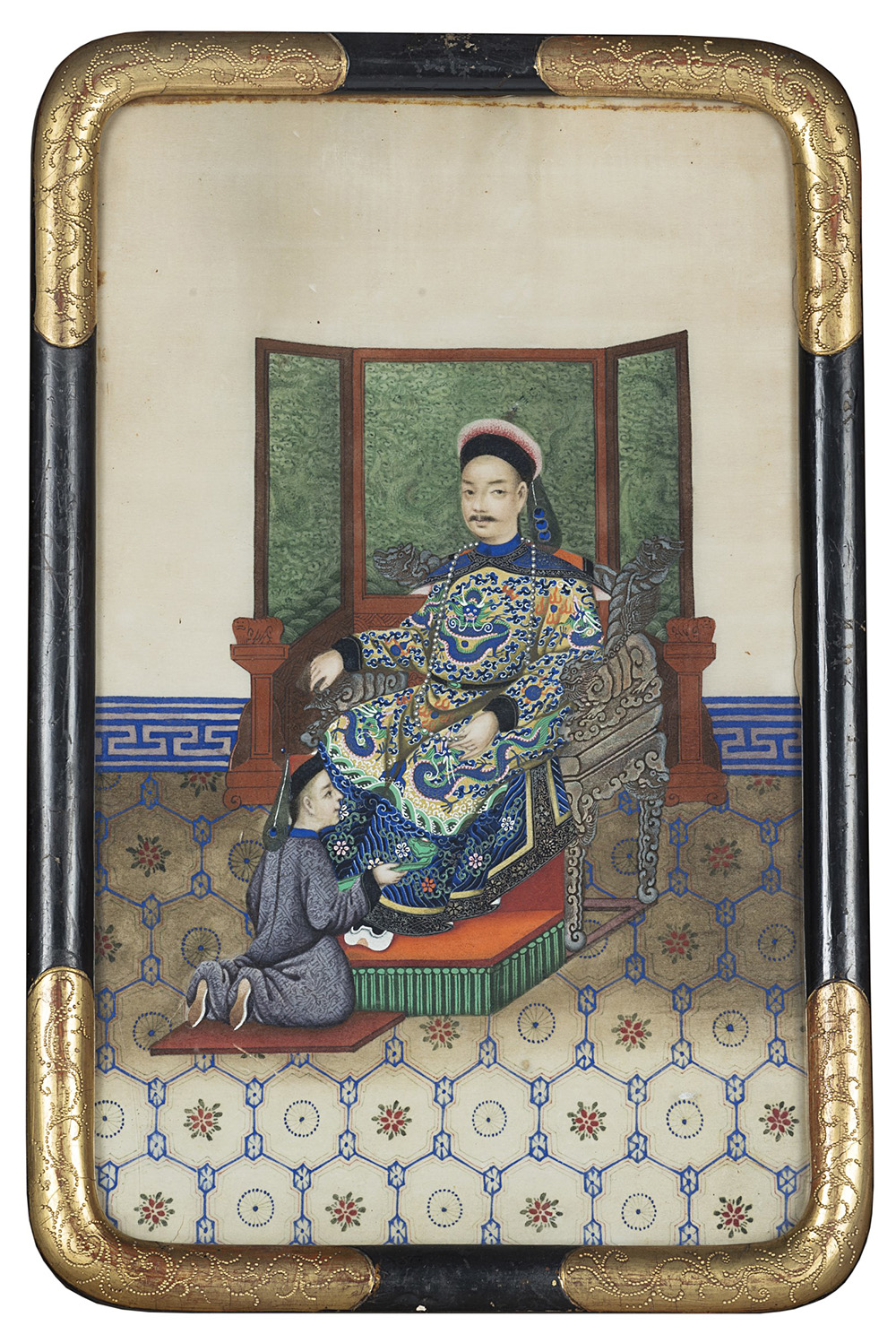 A pair of rice paper painting depicting mandarin couples in interior scenes, framed and glazed