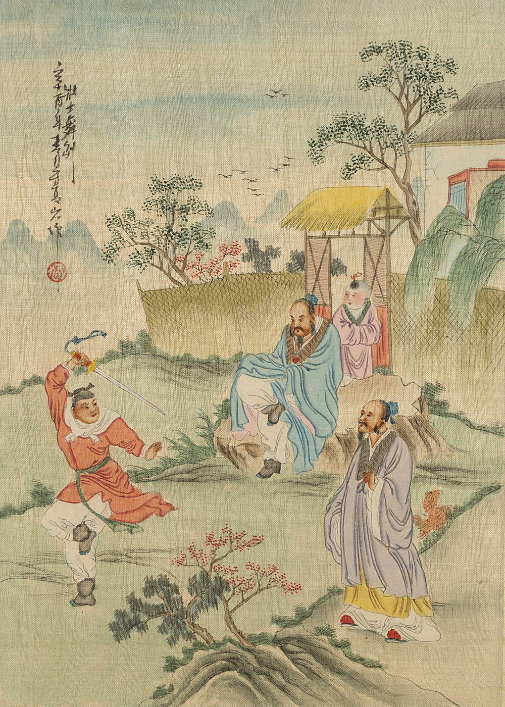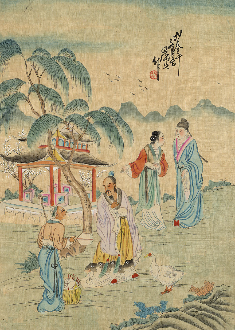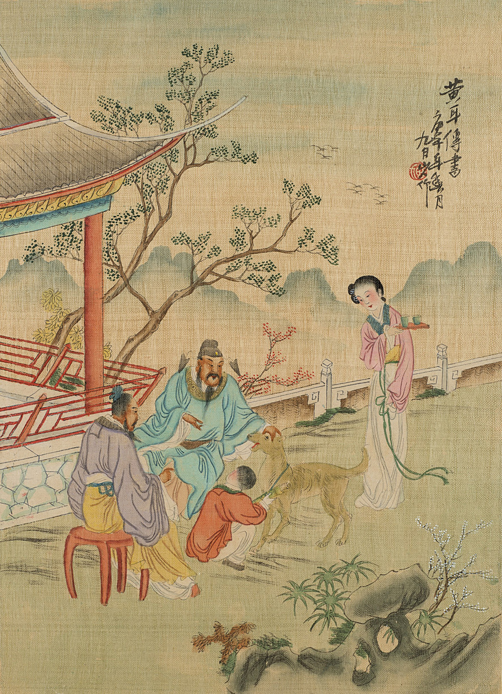 Sette dipinti raffiguranti scene varie, inchiostro e colore su seta, con...