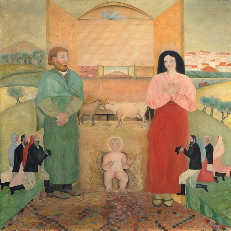 Giuseppe Cesetti Tuscania (Vt) 1902 - 1991 Natività, 1935 Olio su tela, cm. 170x170 Firma in basso a destra: Cesetti. Al verso sul telaio: etichetta Fondazione Premi per le Arti / Premio Roma per la Pittura 193[...]: etichetta Galleria d'Arte "Il Canale", Venezia; sulla tela e sul telaio: tre timbri E.P.T. / Cento Opere dal 1928 al 1957 / Cesetti / Viterbo / 3.12.1961 * 7.1.1962. Storia: Collezione privata, Venezia; Collezione privata Esposizioni: Cesetti, mostra antologica dal 1925 al 1987, Venezia, Scuola Grande S. Giovanni Evangelista, 29 agosto - 3 ottobre 1987, cat. p. 61, n. 18, illustrato a colori. Bibliografia: Rossana Bossaglia, Paolo Levi, Catalogo generale dei dipinti di Giuseppe Cesetti I° repertorio 1923-1989, Giorgio Mondadori & Associati, Milano, 1989, p. 22, n. 35/8.