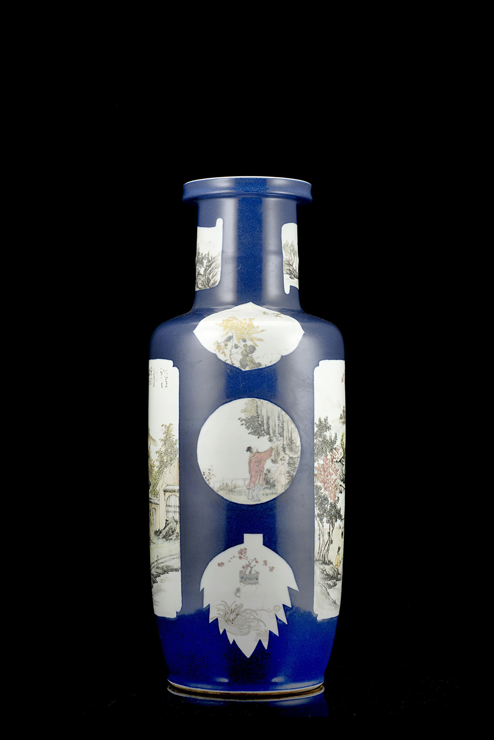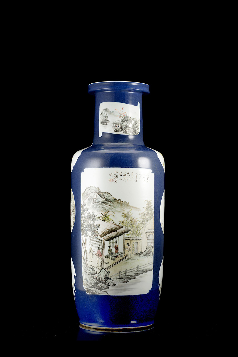 Grande vaso rouleau decorato con scene di paesaggio e calligrafia in pannelli su fondo blu polvere