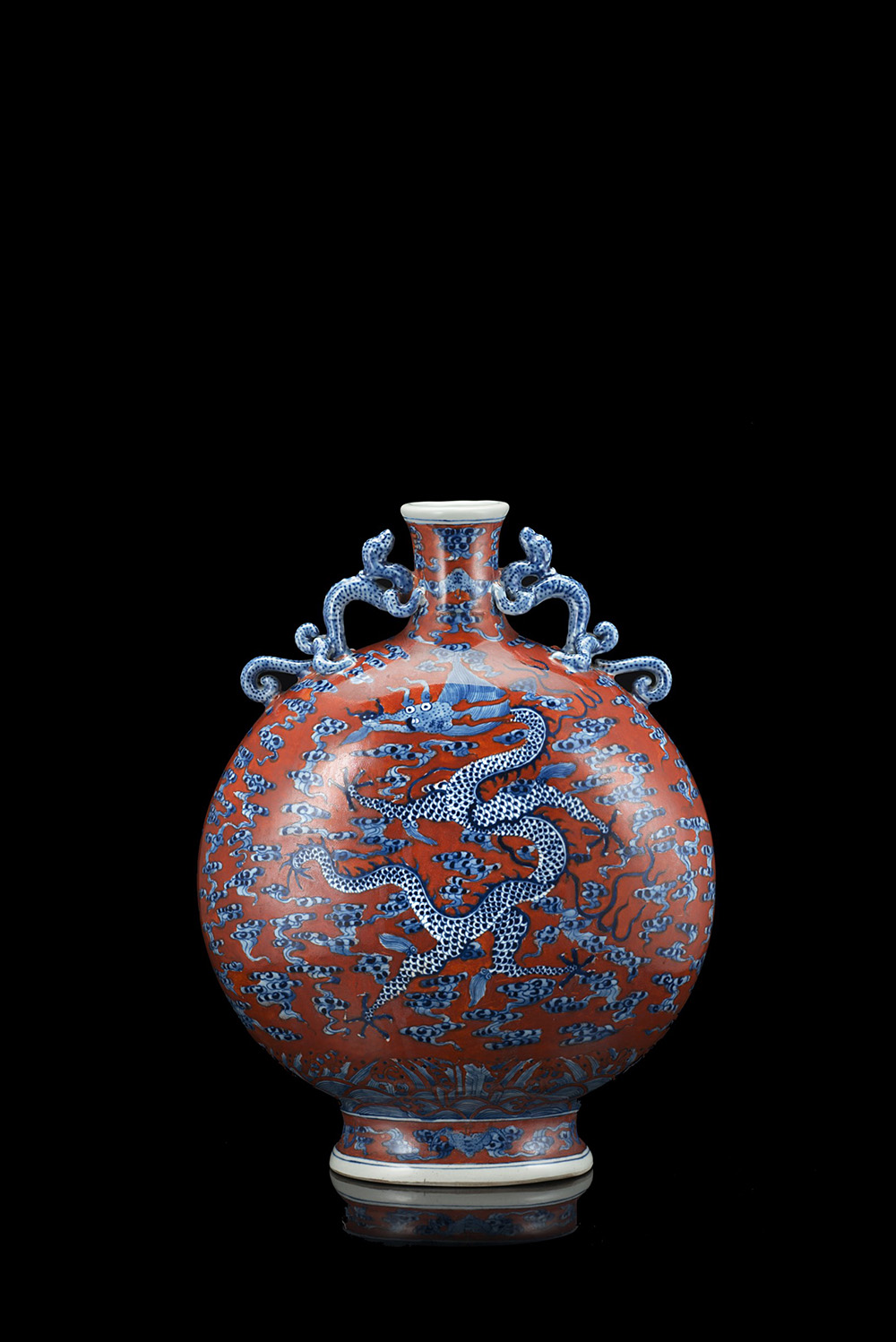 A blue and white moonflask decorated with a dragon amongst clouds on a red ground, with an apocryphal Wanli mark to the base