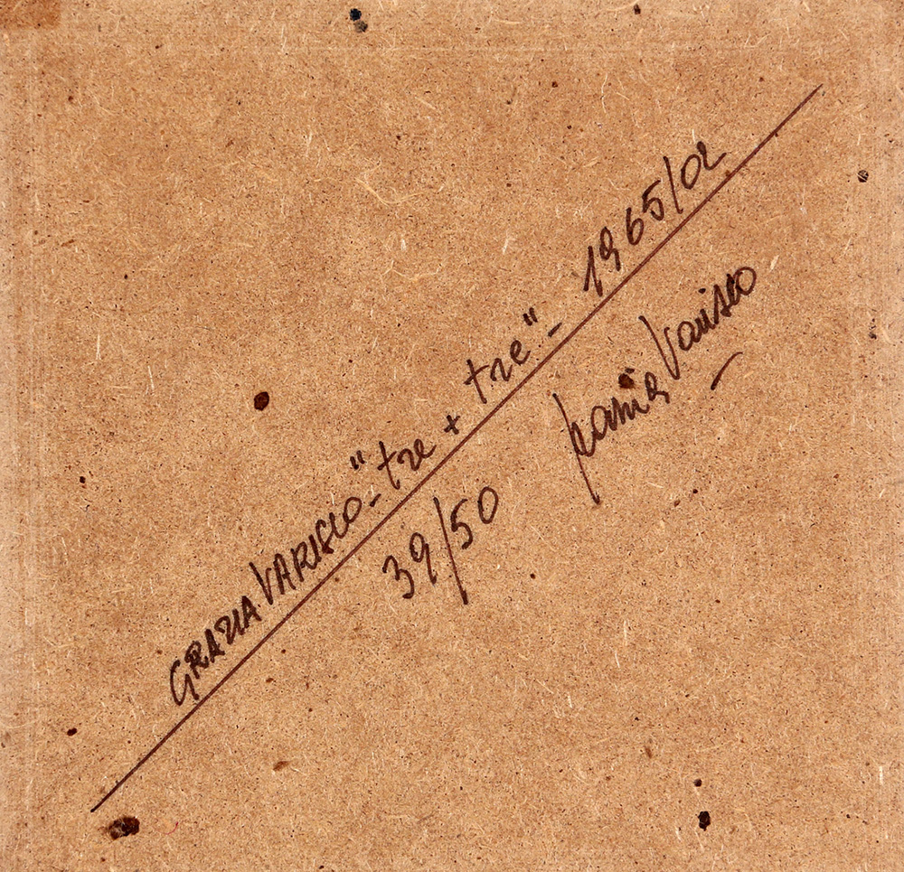 GRAZIA VARISCO 1937 Tre + Tre, 1965 - 2002 Multiplo, vetro, legno ed elementi in plastica, cm. 18 x 18 x 1,5 Firmato e datato sul retro Opera n. 39/50 Prov. Collezione Privata