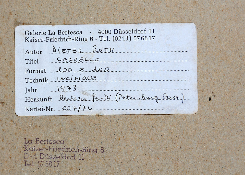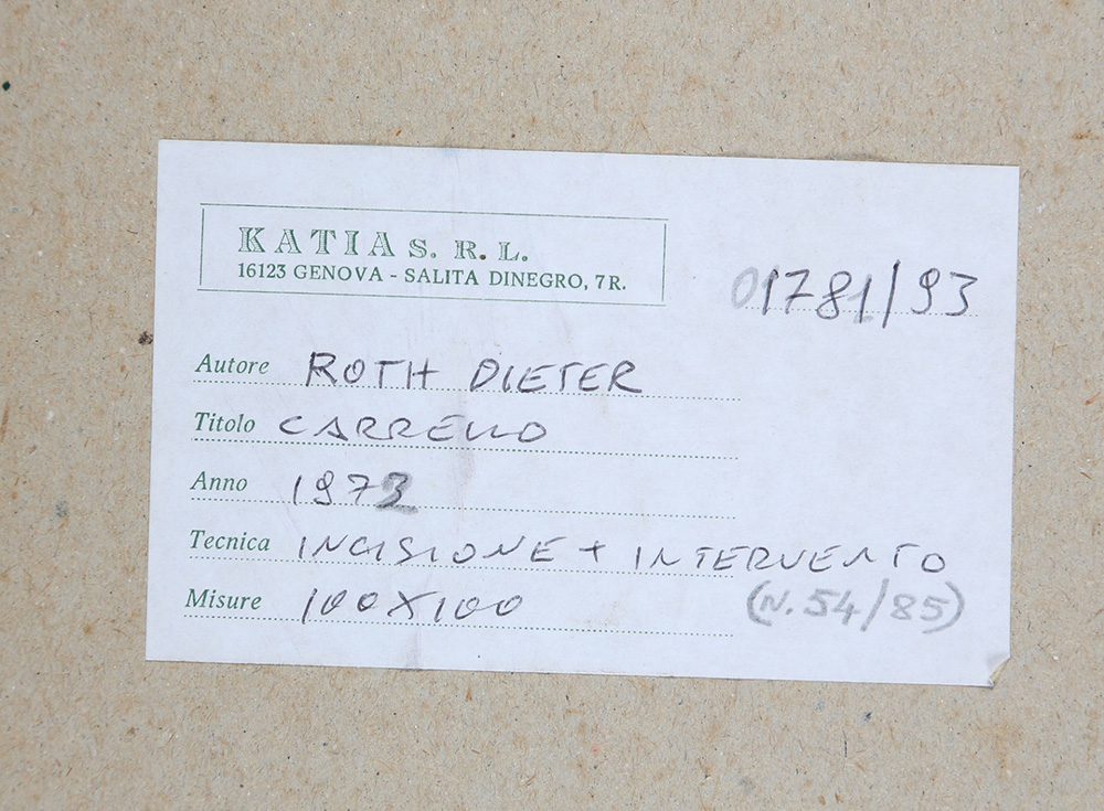 DIETER ROTH 1930 - 1998 Carrello, 1972-73 Incisione con intervento manuale dell’artista, cm. 100 x 100 Firmato in basso a sinistra Opera n. 54/85 Etichetta e timbro Galerie La Bertesca, Dusseldorf sul retro Timbro Galleria La Bertesca, Genova sul retro Etichetta Katia S.r.l, Genova sul retro ESPOSIZIONI: Galleria La Bertesca, Genova, 1973 Prov. Collezione Privata