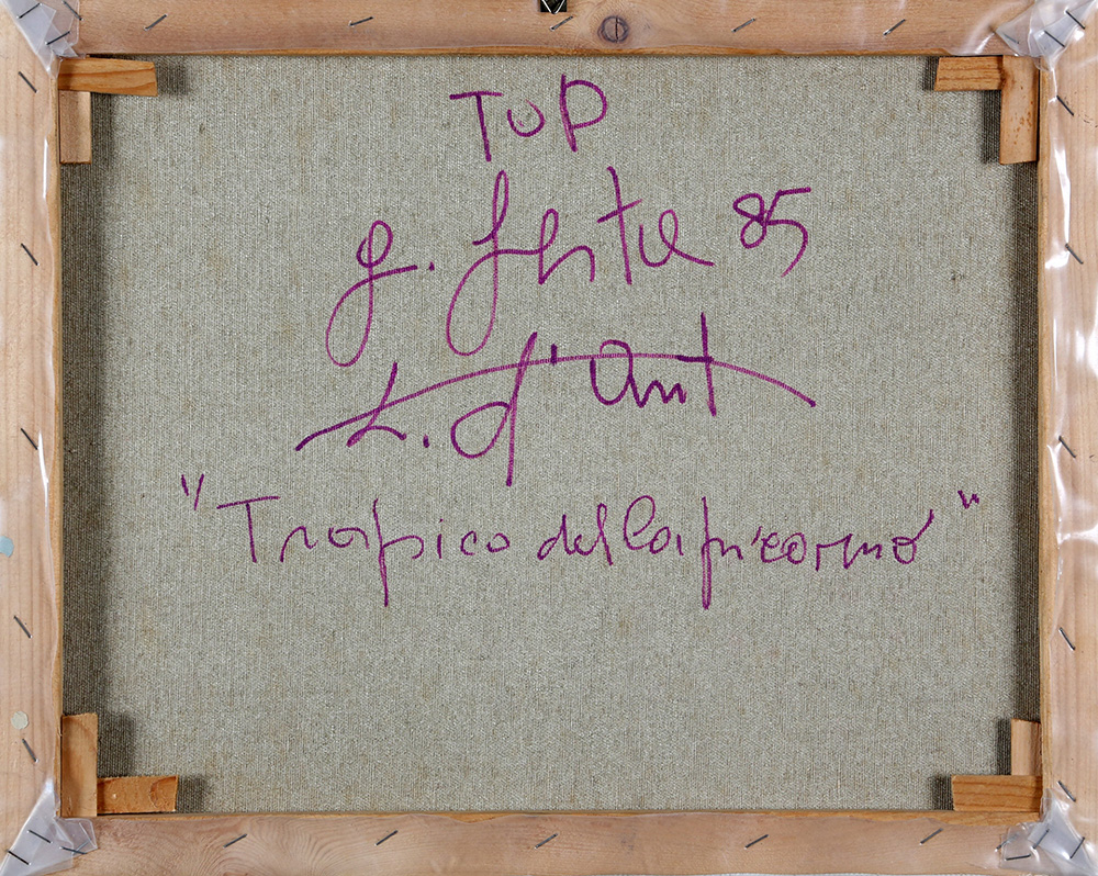 TANO FESTA 1938 - 1988 Tropico del capricorno, 1985 Acrilico e coriandoli su tela, cm. 40 x 50 Datato e firmato sul retro Certificato di Autenticità dell'Archivio Generale dell'Opera di Tano Festa Prov. Collezione Privata