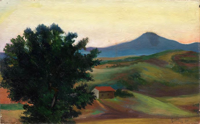 Renato Guttuso Bagheria (Pa) 1912 - Roma 1987 Paesaggio, 1951 Olio su tela, cm. 24,8x40 Firma e data in basso a destra: Guttuso 51; firma al verso sulla tela: Guttuso: etichetta Collezione Gugliano. Bibliografia: Enrico Crispolti, Catalogo ragionato generale dei dipinti di Renato Guttuso, vol. 1, Ediz. Giorgio Mondadori, Milano, 1983, p. 237, n. 51/16. Rintelato.