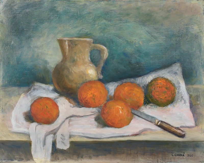 Carlo Carrà Quargnento (Al) 1881 - Milano 1966 Natura morta, 1941 Olio su cartone telato, cm. 40x50 Firma e data in basso a destra: C. Carrà 941. Al verso: timbro con n. 43, e etichetta Galleria del Cavallino Venezia. Storia: Collezione Enrico Mattei; Collezione privata Certificato su foto di Massimo Carrà, Milano, 27 marzo 2000.