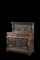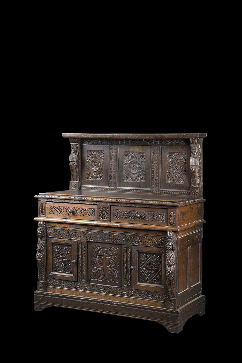 Credenza con alzata in rovere con parte superiore con montanti intagliati a erme e pannelli scolpiti a motivi vegetali. Fronte a due cassetti e due ante decorati a motivi geometrici, montanti scolpiti a figure. Datata sul fronte 1661. Francia, sec. XVII (cm 136x152x57) (restauri)