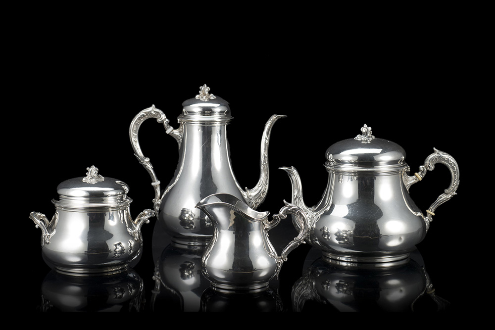 Servizio da tè e caffè in argento composto da caffettiera, teiera, lattiera e zuccheriera, con corpi a balaustro liscio, beccucci e prese sagomati a volute fogliate. Francia, inizi sec. XX, argentiere Tetard Freres. Importatore italiano Federico Tornotti Torino-Roma (h. max cm 20 ca.) (gr 1760 ca.) (difetti)