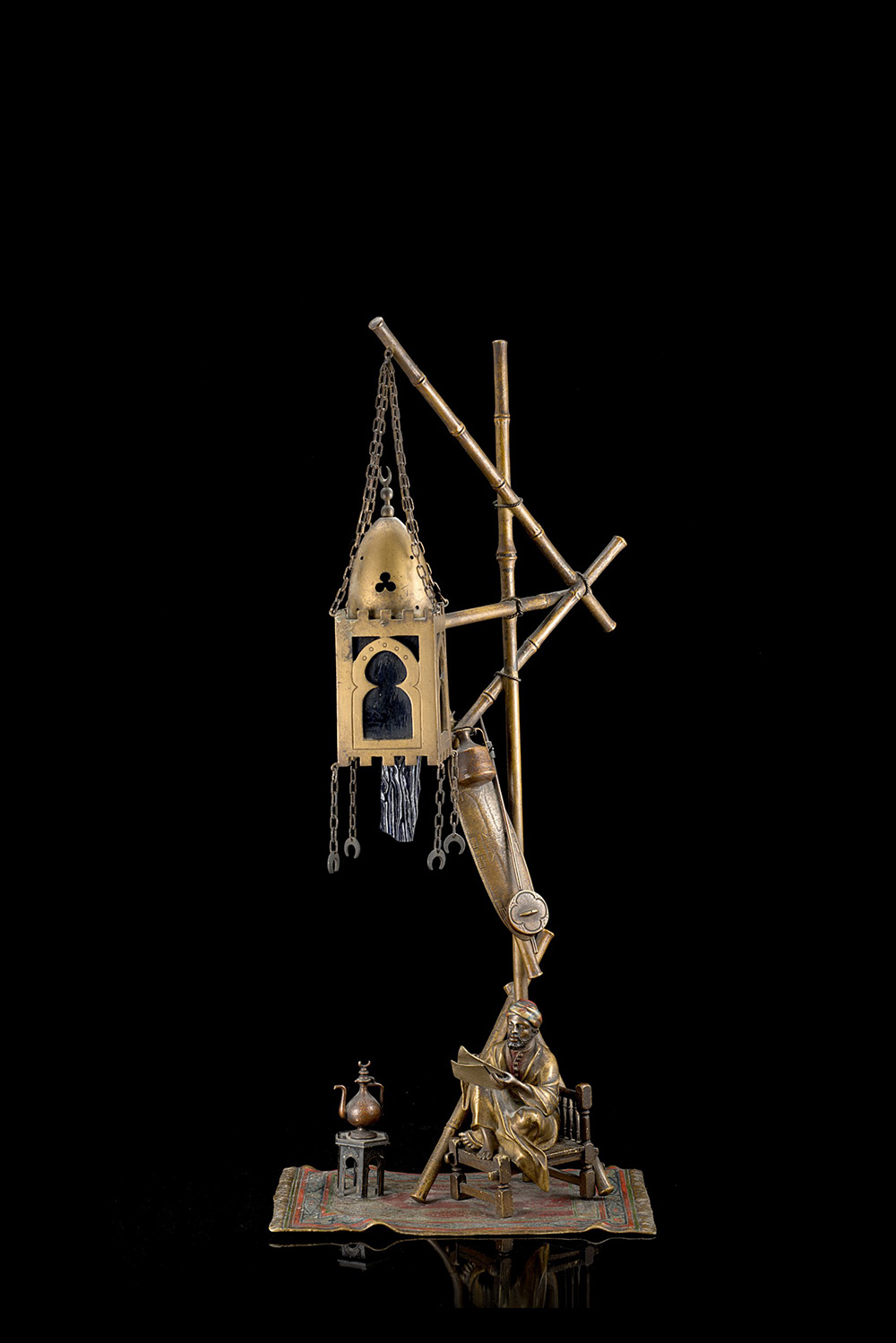 "Interno con arabo assiso" lampada in bronzo decorata a freddo, firmata Nam Greb sulla base (h. cm 48) (mancanze)