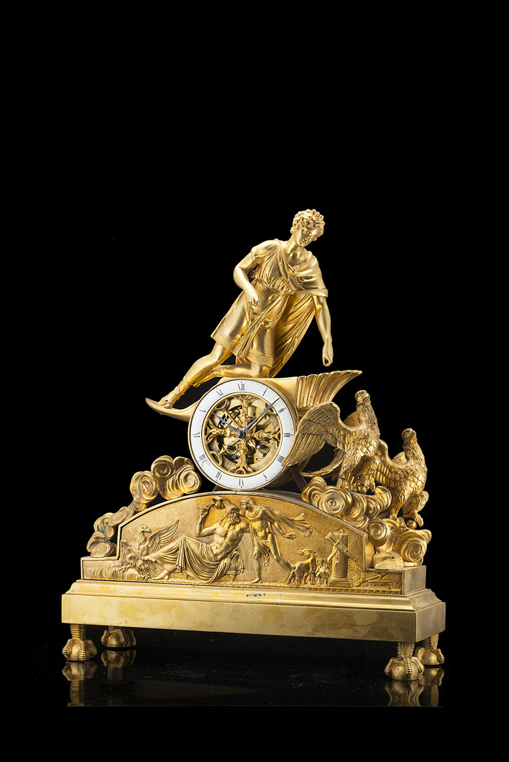 Pendola in bronzo dorato decorata con figura su biga trainato da aquile
