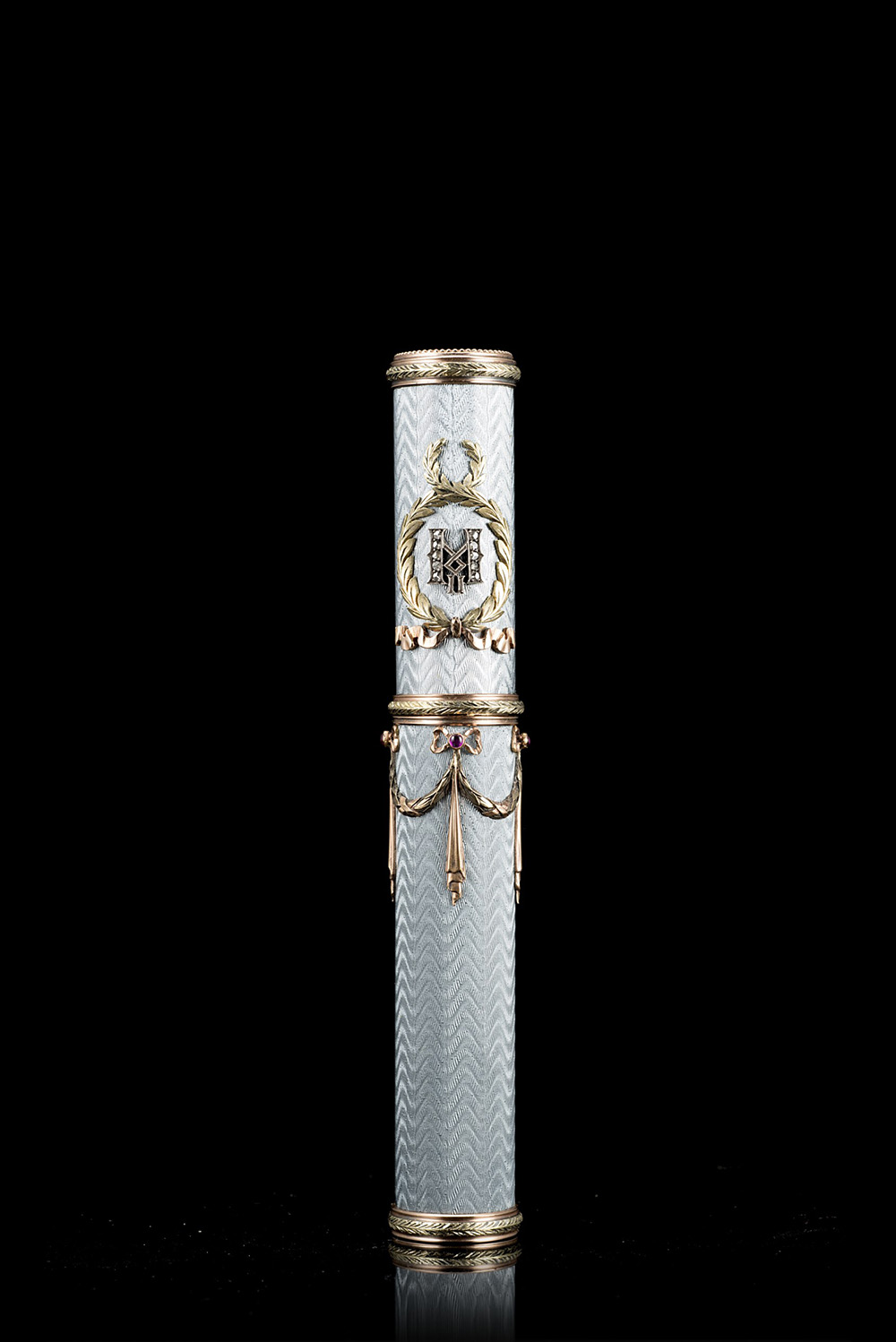Portasigari in oro 14K, smalto traslucido turchese, diamanti e cabochons; corpo cilindrico decorato a guillochè con applicazioni di festoni, nastri, cinture fogliate e monogramma dello zar Nicola II entro ghirlanda. Marchi di imitazione di: San Pietroburgo 1899-1908, K. Fabergè e H. Wigstrom (cm lungh. 14,5 ca.) (gr 113 ca.) In custodia
