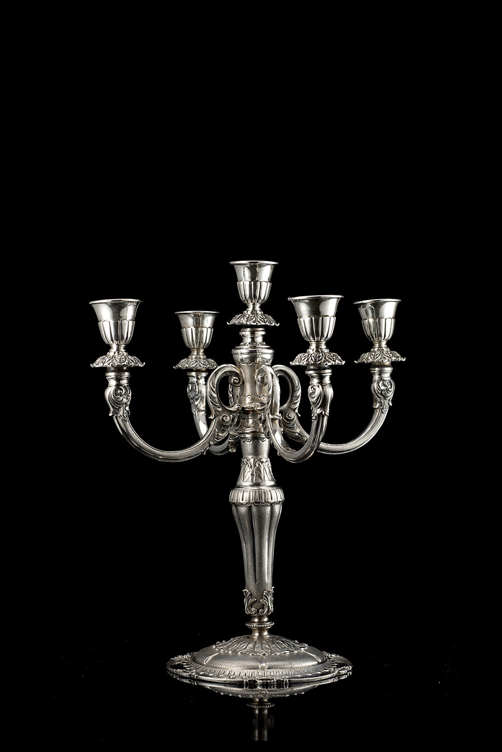 Candelabro in argento a cinque fiamme con piede circolare sagomato, fusto a...