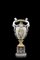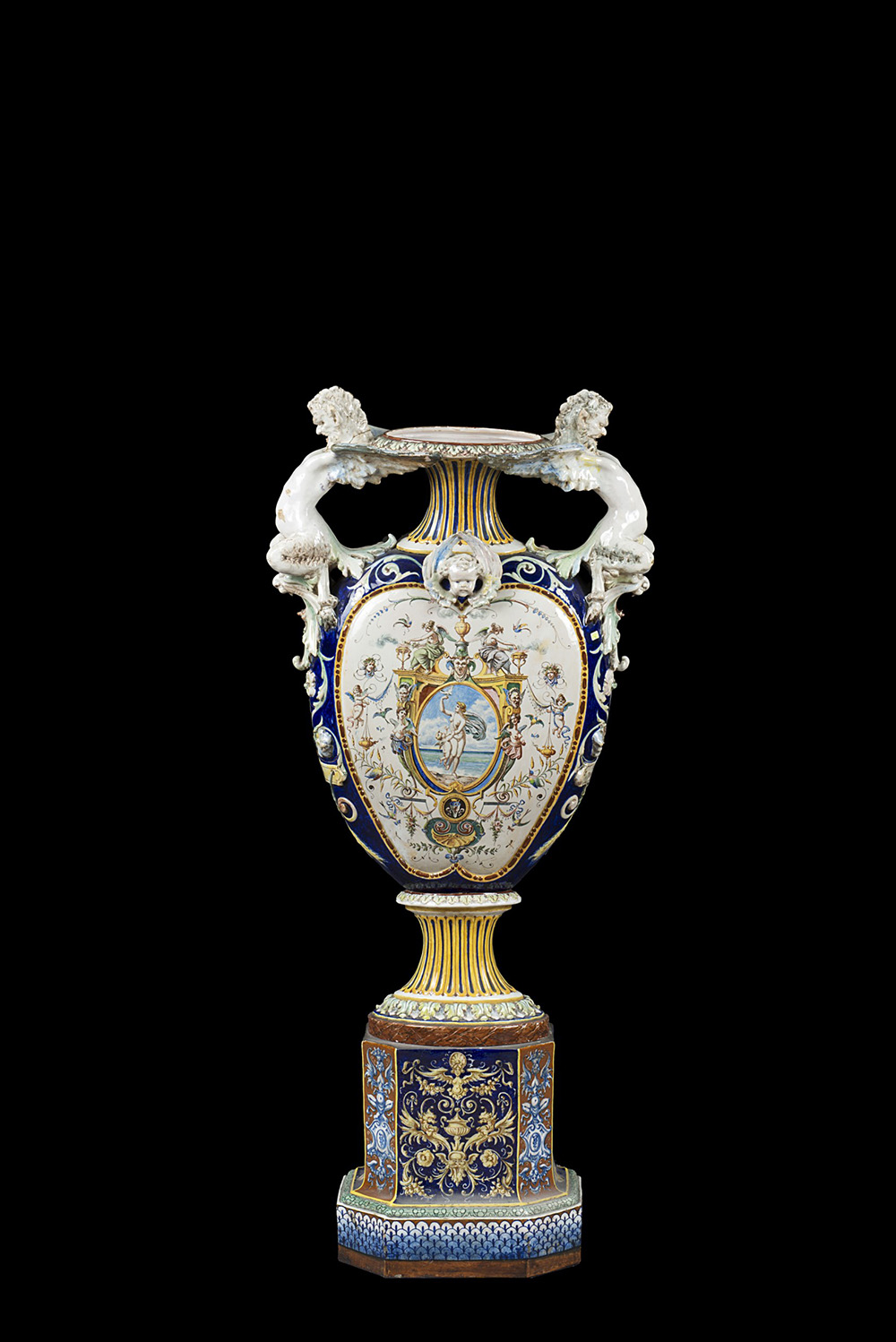 Manifattura di Faenza, Ceramiche Riunite, sec. XX. Grande anfora biansata in ceramica decorata in policromia a raffaellesche e figure mitologiche. Anse a satiri a tutto tondo. Base di forma ottagonale (h. cm 134) (difetti)