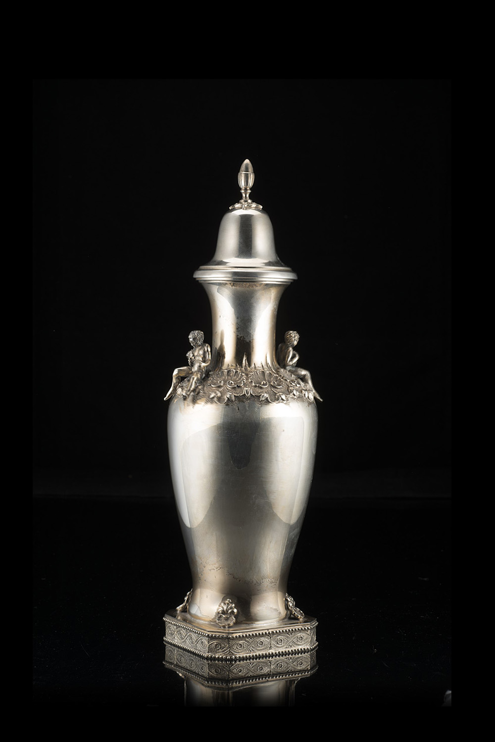 Vaso in argento con corpo a balaustro su plinto quadrato, decorato da fasce di conchiglie, fiori e putti a tutto tondo, nastri intrecciati e perlinature; coperchio a campana con pomolo a ghianda. Milano, metà sec. XX, argentiere Meloncelli Ferdinando fu Giovanni Battista (h. cm 40 ca.) (gr 1280 ca.) (lievi difetti)