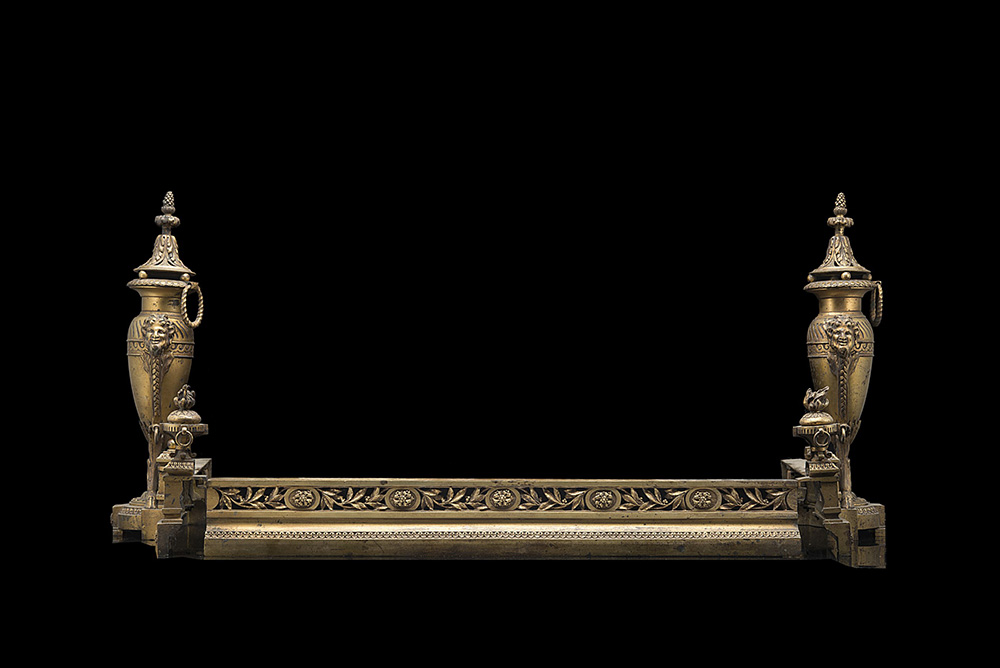 Ringhiera da camino in bronzo con ai lati vasi decorati con figure grottesche e fiamme. Fascia traforata a volute e foglie (h. cm 46 x largh. cm 120)