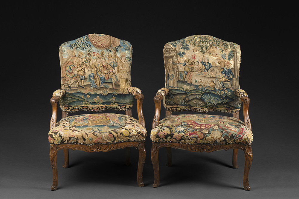 A pair of 18th-century French wooden armchairs covered with needlepoint tapestry (defects)