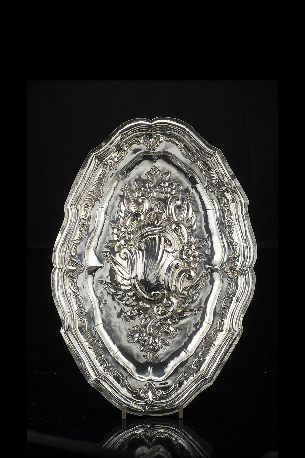 Piatto da parata in argento di forma ovale mistilinea, sbalzato e cesellato con motivi floreali volute e frange zigrinate. Spagna, sec. XVIII (cm 51x34 ca.) (gr 930 ca.) (difetti)