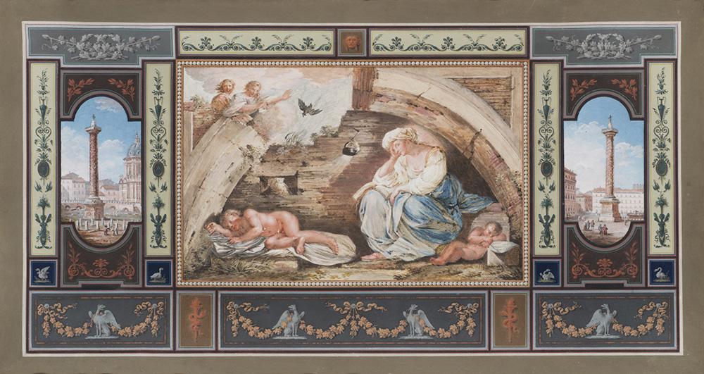 "Allegoria della Notte" scena centrale tratta dall'affresco di Guercino per il Casino Ludovisi realizzata per un progetto di decorazione di parete in stile romano antico; ai lati due predelle raffiguranti la Colonna Traiana e quella di Marco Aurelio, tempera su pergamena (cm 20,5x38,5 circa)in cornice