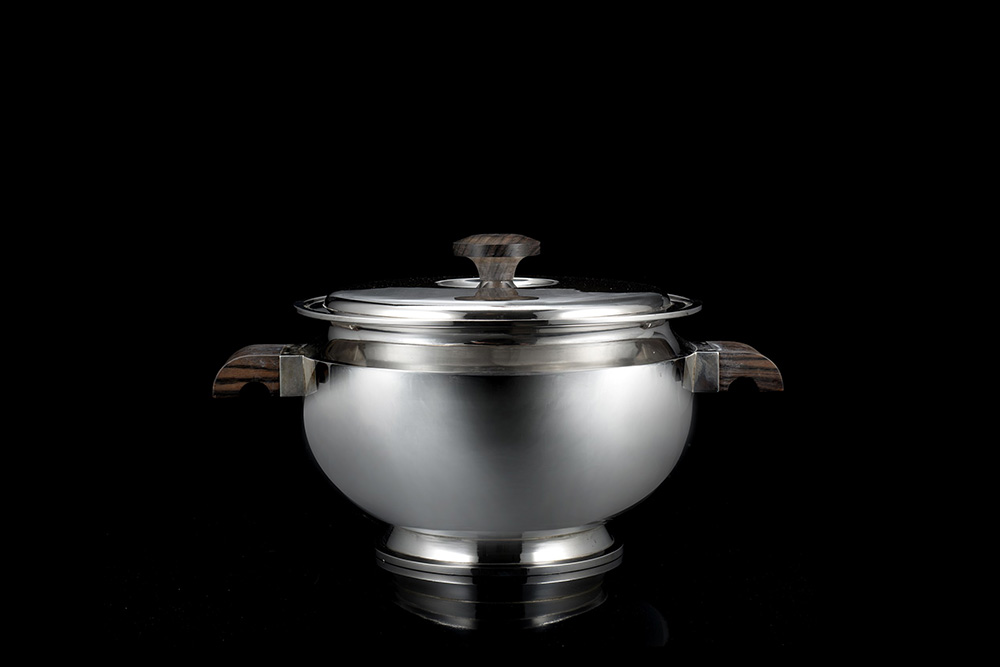 Zuppiera in argento di forma circolare e superficie liscia, con coperchio piatto; prese in legno sagomato e tornito. Alessandria, anni 30/40 del sec. XX, argentiere Ricci Cesa. Marchio del Fascio. Marcato Miracoli (lungh. max cm 35 ca.; h cm 19 ca.) (gr lordi 1850 ca.) (lievi difetti)