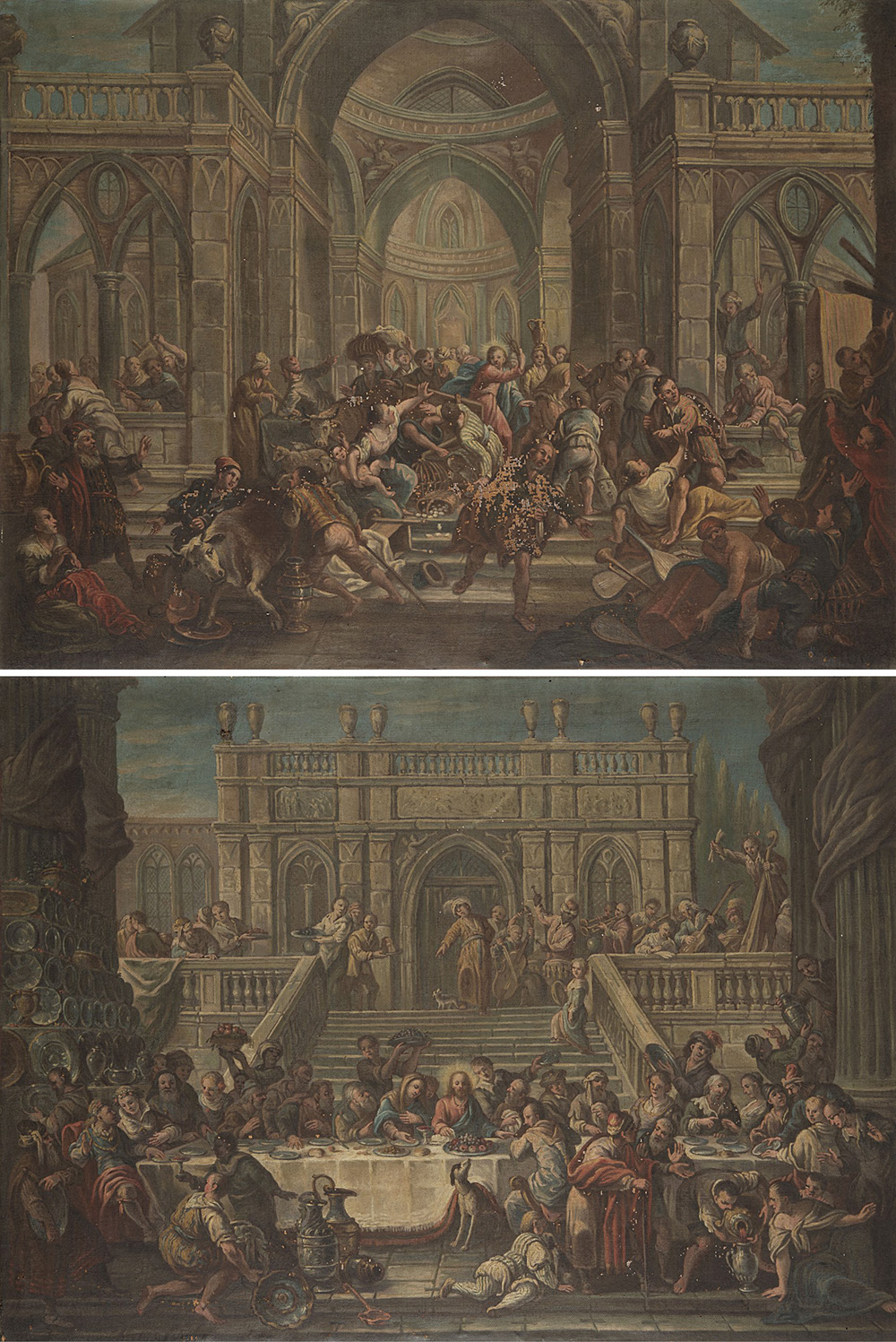 Scuola veneta del secolo XVIII "Cacciata dei mercanti dal tempio" e "Le nozze...