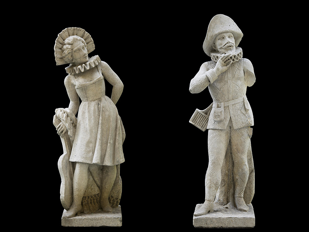 Arte veneta "Maschere" coppia di sculture da giardino in pietra, poggianti su basi squadrate (h. cm 142) (difetti e mancanze)