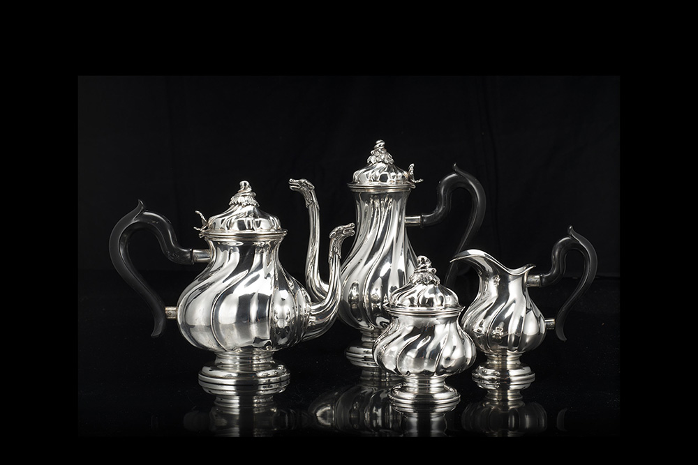Servizio in argento nello stile del barocchetto genovese, composto da caffettiera, teiera, zuccheriera e lattiera; corpi piriformi con nervature tortili, versatoi zoomorfi a collo di cigno, applicazioni di gusto rocaille e manici ad ansa in legno ebanizzato. Milano, metà sec. XX. Argentiere Verpelli (h. max cm 27 ca.) (gr 2600 ca.) (lievi difetti)