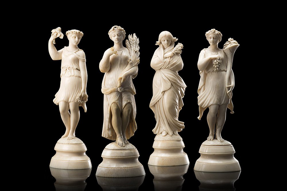 Group of four 18th-century ivory sculptures depicting the allegories of the four seasons (h. cm 17.5) (restorations and losses)