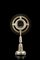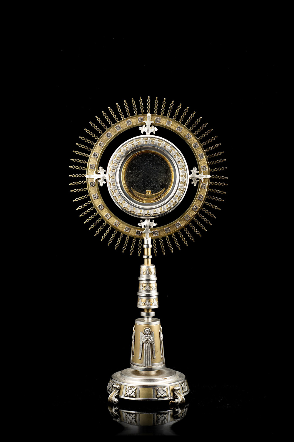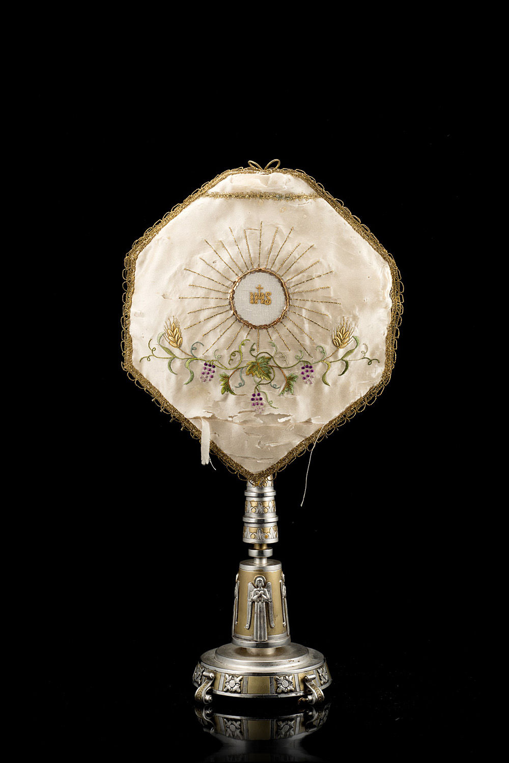 Ostensorio romano in argento con parti dorate a contrasto; base circolare con piedini a mensola rovesciata, fusto a colonna rastremata verso l'alto con teca circondata da palmette, fiori e raggi; completa di custodia protettiva in cotone con rivestimento in seta ricamata. Sec. XX (h. cm 50) (gr lordi 1960 ca.) (difetti)