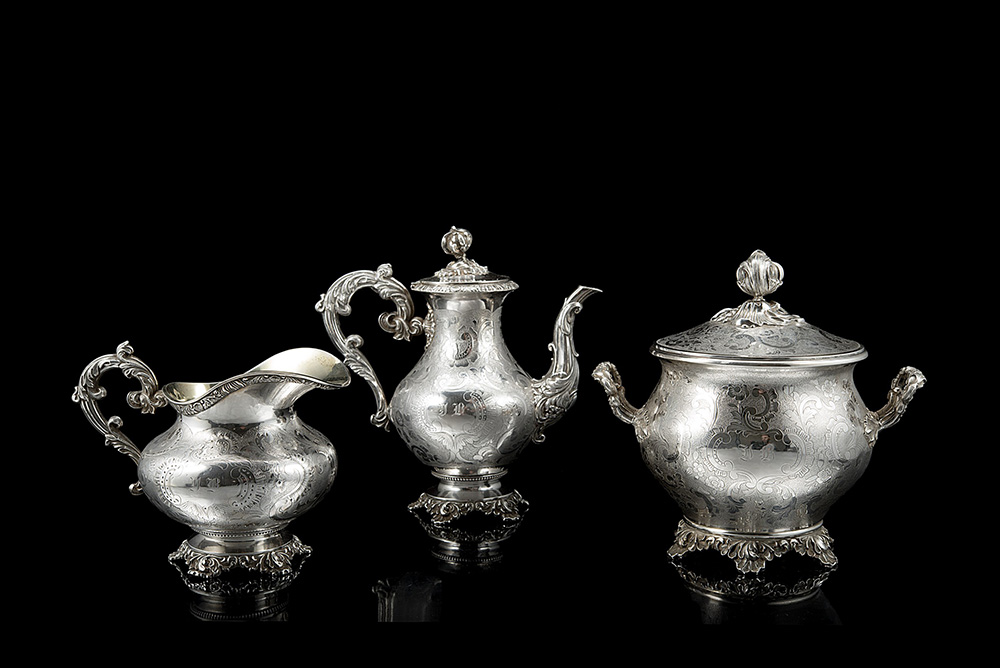Servizio da caffè in argento composto da caffettiera, zuccheriera e lattiera, con corpo piriforme decorato a volute e motivi floreali su fondo zigrinato, base a cinque piedini sagomati a conchiglie fogliate e pomoli a bocciolo. Francia, fine sec. XIX (h. max cm 19 ca.) (gr tot 1330 ca.) (lievi difetti)