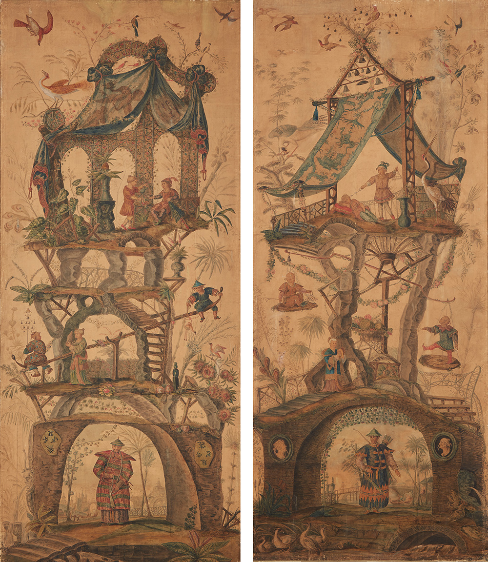 Due pannelli dipinti su carta intelata decorati a chinoiserie con personaggi in abiti orientali su due registri sovrapposti con costruzioni, piante e volatili che inquadrano paesaggi. Piemonte, sec. XVIII (cm 301x132) (difetti e restauri)