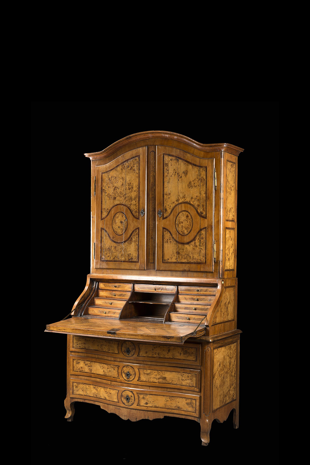 Mobile a due corpi in noce e radica decorato a specchiature e filettature. Parte superiore a due ante, parte inferiore di forma mossa a tre cassetti e anta ribaltabile con scarabattolo a cassettini, vani e segreto. Sec. XVIII (cm 130x230x165) (difetti e restauri)