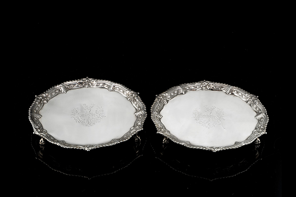 Coppia di salver in argento di forma circolare sagomata, con fondo liscio inciso, bordo sagomato decorato a conchiglie fogliate e godroni. Londra, 1770. Argentiere Elizabeth Cooke (d. cm 23 ca.) (gr tot 900 ca.) (difetti)