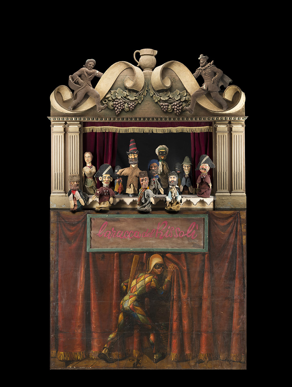 Teatro dei burattini da Commedia dell'Arte in legno intagliato e laccato a volute e frutti. Sipario dipinto con figura di Arlecchino. Corredato di dodici burattini diversi. Arte Bergamasca, inizio sec. XX (difetti e mancanze)