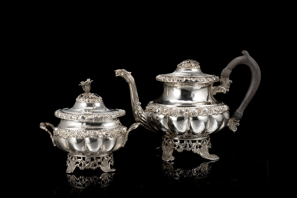 Teiera e zuccheriera in argento con corpo a balaustro, baccellato e decorato a fasce di frutti, fiori e conchiglie; coperchio con pomolo in figura di fiore, versatoio zoomorfo, piede a volute fogliate e manici in argento e legno. Regno delle Due Sicilie, Napoli, assaggiatore Paolo De Blasio, 1832-35, argentiere G R. (h. max cm 21 x l 29 ca.) (gr 1570 ca.) (difetti e mancanze)