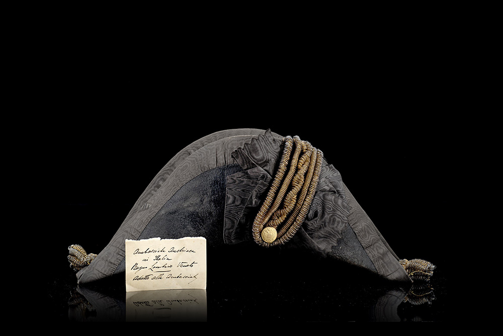 Feluca in feltro, con bordure in seta e canottiglie in fili d'argento dorato, bottone dorato con le armi del Lombardo Veneto. In scatola originale con biglietto d'epoca proveniente dall'Ambasciata Austriaca (l. cm 32) (difetti)