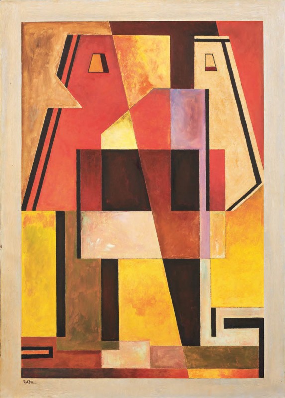 Mario Radice Como 1900 - 1987 Composizione 3 R.S., (1948) Olio su tela, cm. 99x70 Firma in basso a destra: Radice; al verso sul telaio titolo e firma: 3 R.S. Radice; sulla tela: dichiarazione di autenticità dell'artista, Como, 20-3-1970. Certificato su foto di Luciano Caramel in data 25.5.2011.
